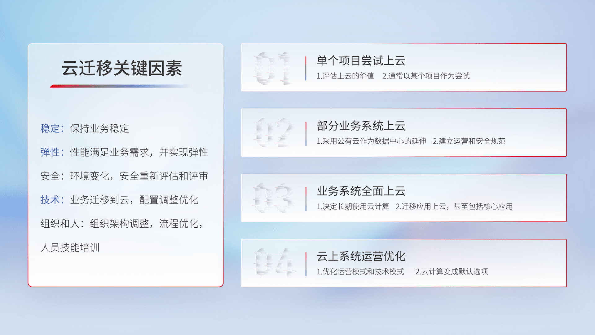 结合实际业务,,,从规划设计、、、云平台选型、、、、云原生改造、、数据迁移、、、、集成交付,,,,迁移全过程为客户识别最佳上云路径,,,,做好风险识别管理,,,设计网络架构、、、身份权限、、安全审计合规、、、操作审计、、、、日志审计、、、监控告警策略、、多站点容灾设计等,,,对云上基础设施进行整体规划,,,提升IT治理水平,,,,以满足弹性、、、、高可用、、高性能的需求。。。。